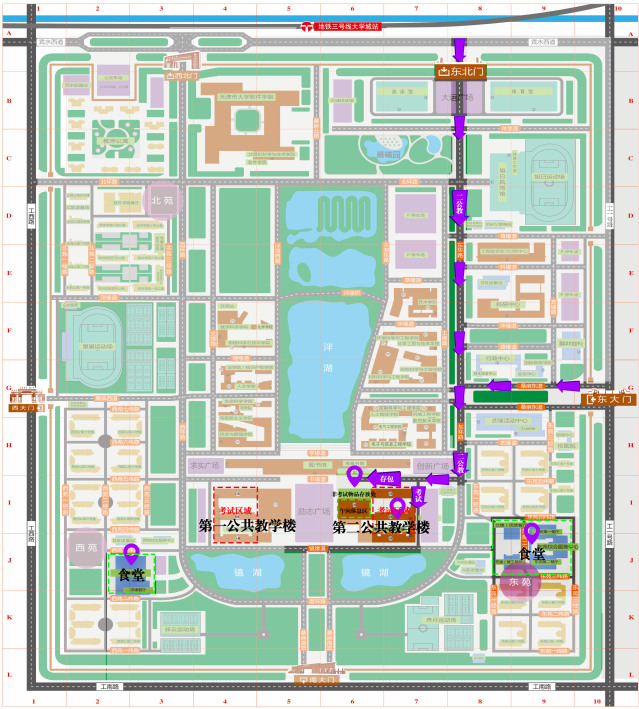 本考点考场主要分布在第一公共教学楼和第二公共教学楼,其中校外考生均在第二公共教学楼参加考试。考生可从学校东门、东北门入校,东门至第二公共教学楼步行约需10-15分钟,从东北门入校步行约需15-20分钟,请考生预留足够的时间进行安检和入场。进校路线、考场位置和就餐地点等如下图所示。